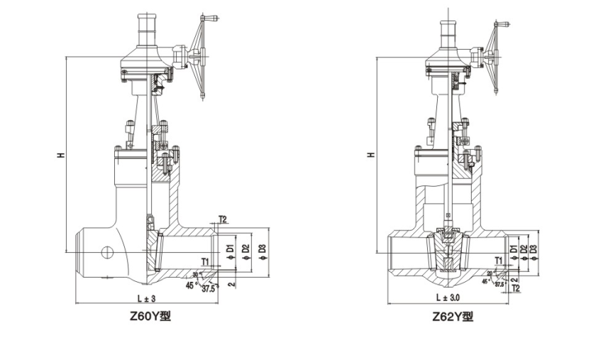 集團生產的Z61Y-250、Z61Y-320型高壓電站閘閥:手動、對接焊連接形式、明桿楔式剛性單閘板,閥座密封面材料為硬質合金,公稱壓力PN250~PN320,閥體材料為碳素鋼的高溫高壓電站閘閥。